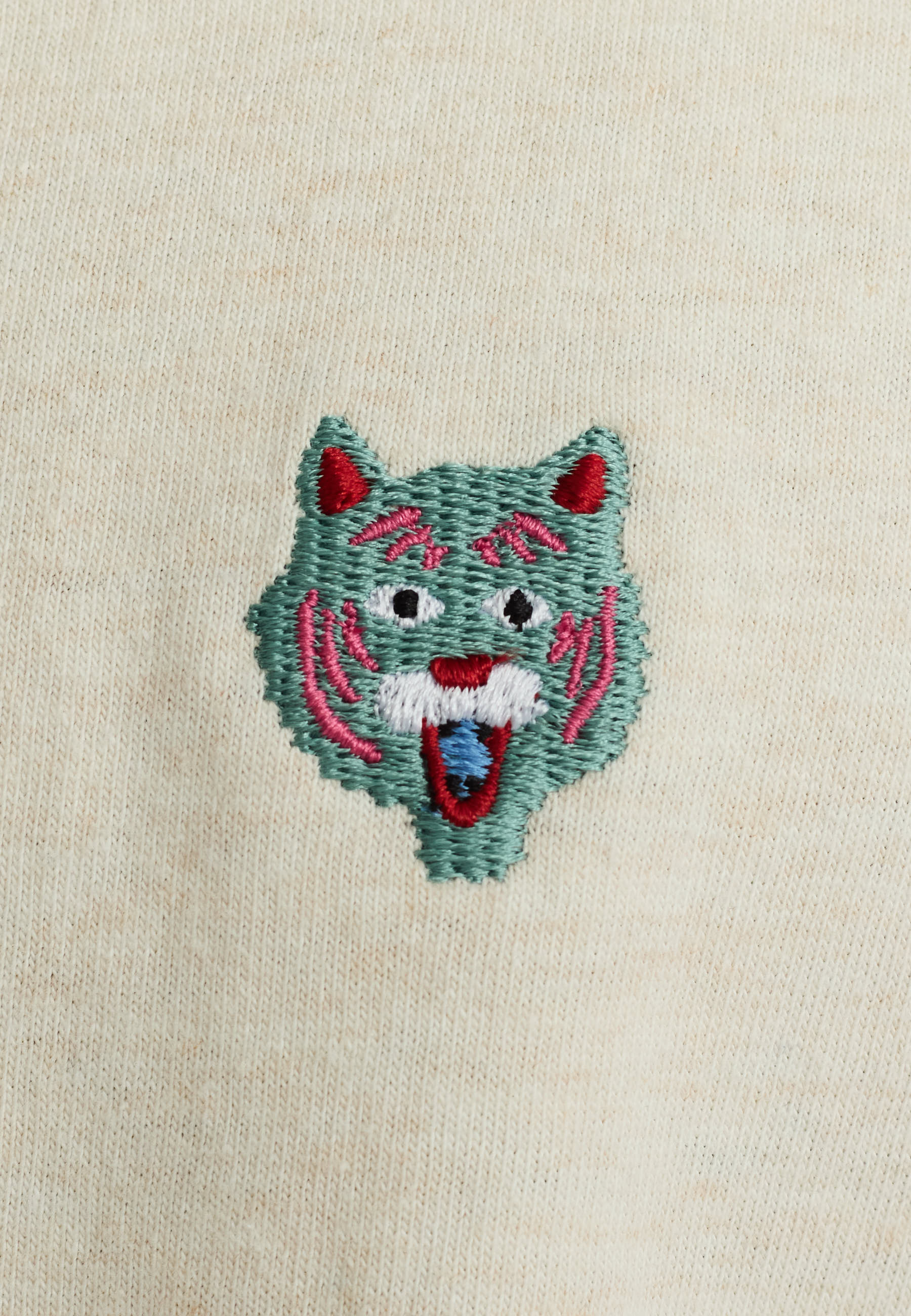 Loose-fitted t-shirt with a round neck and short sleeves, made in a mélange organic cotton-jersey, with a weight of 200 GSM. The t-shirt features a small fun, colorful embroidery on the chest, a rib collar and the hem is made with a twin needle stitch. The finishing of the t-shirt adds softness and ensures stability and durability to the style
