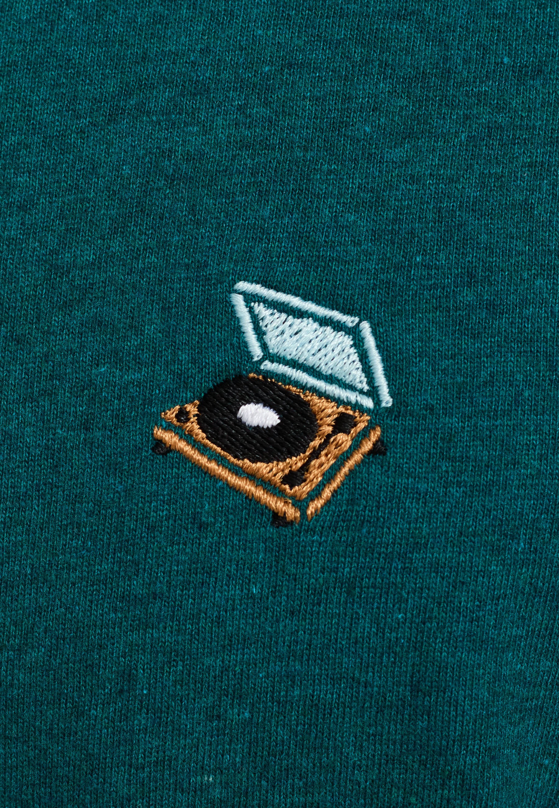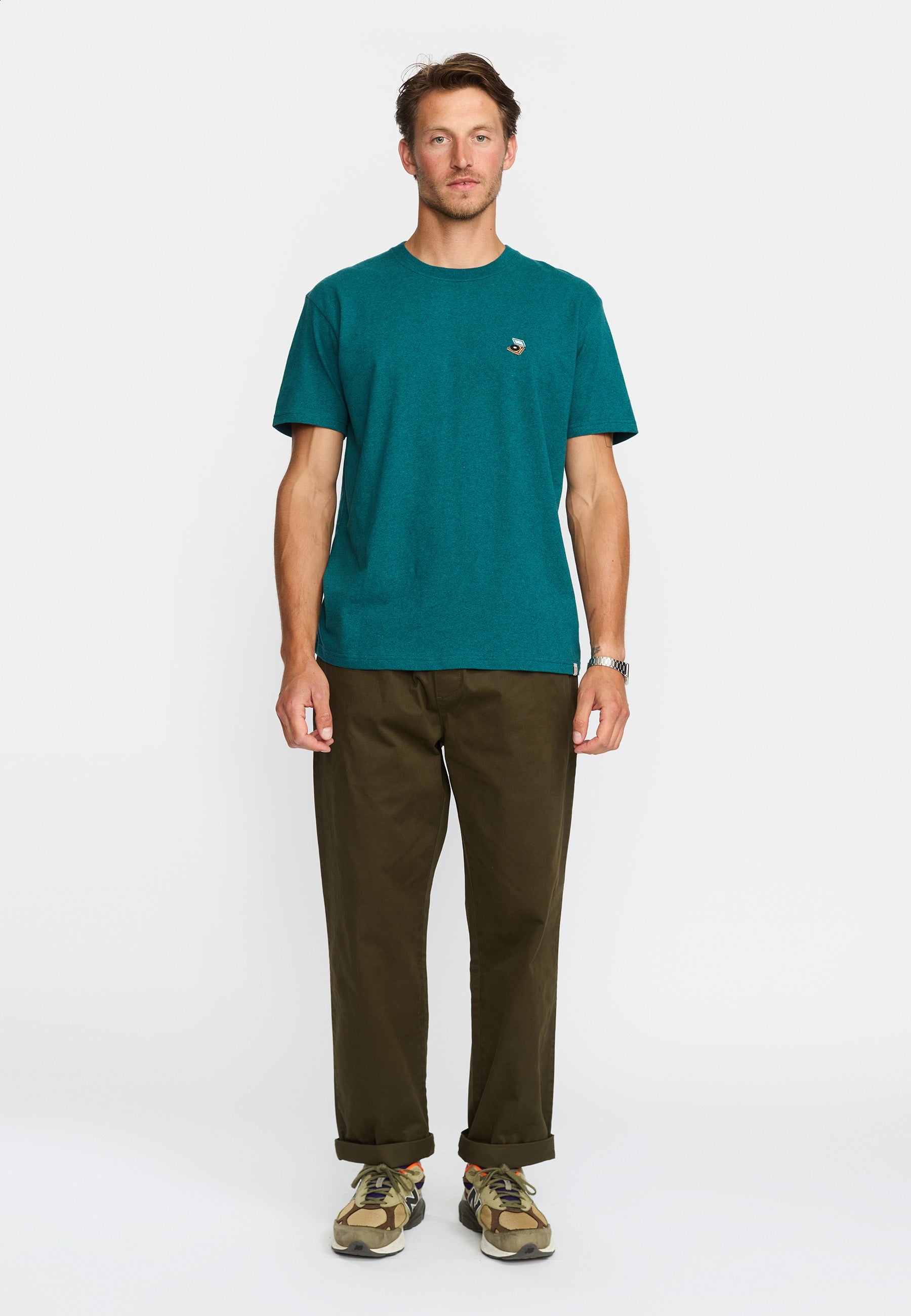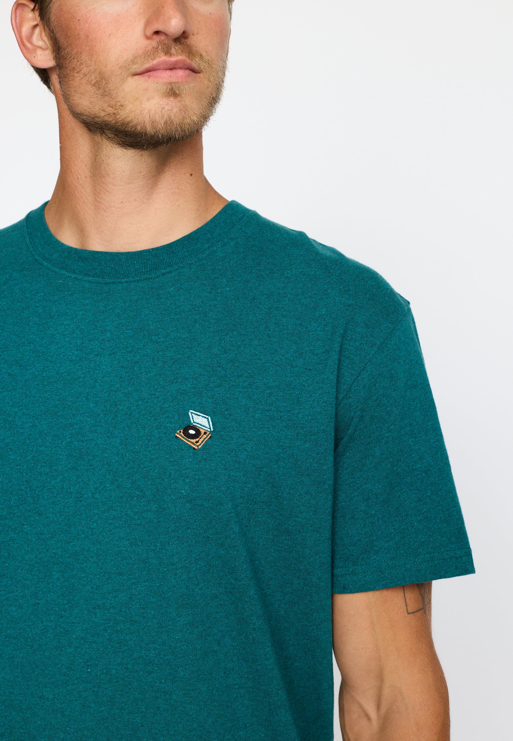Loose-fitted t-shirt with a round neck and short sleeves, made of a mélange organic cotton-jersey, with a weight of 200 GSM. The t-shirt features a small fun, colorful embroidery on the chest, a rib collar and the hem is made with a twin needle stitch. The finishing of the t-shirt adds softness and ensures stability and durability to the style