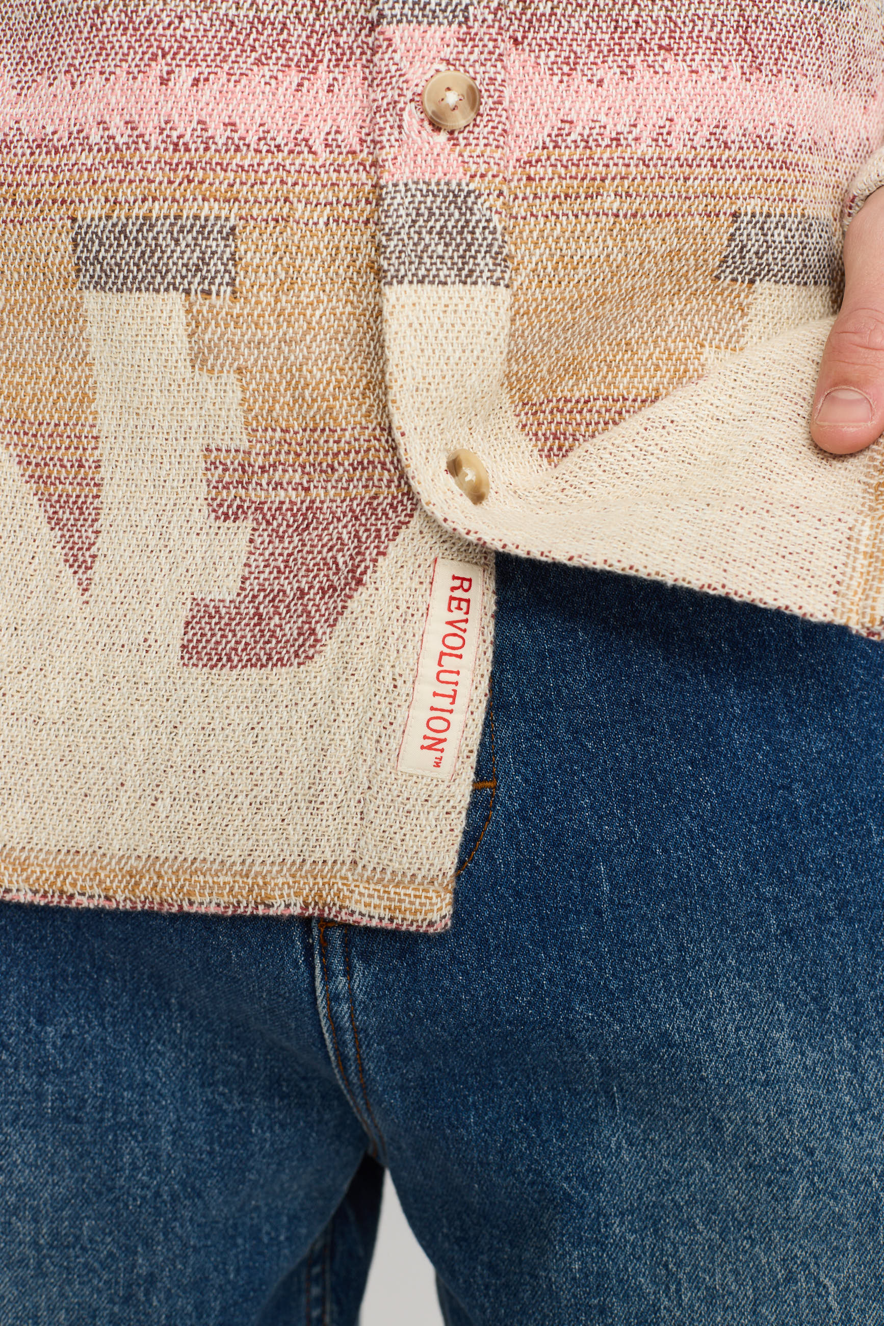 This loose shirt is designed with a single sharp-cut chest pocket and a button-up front, finished with 4-hole buttons and made of a mid-weight soft cotton fabric. The shirt has adjustable cuffs for extra comfort and is constructed with a double-layer yoke and a box-pleat center back for strength and better mobility. The pattern in sun faded colors with the characteristic geometric shapes is inspired by ancient Aztek traditions and is woven in a jacquard technique. A jacquard woven fabric is made by pre-dyeing the yarns before they are woven, which ensures a better color fastness and durability compared to designs that are simply printed onto the fabric