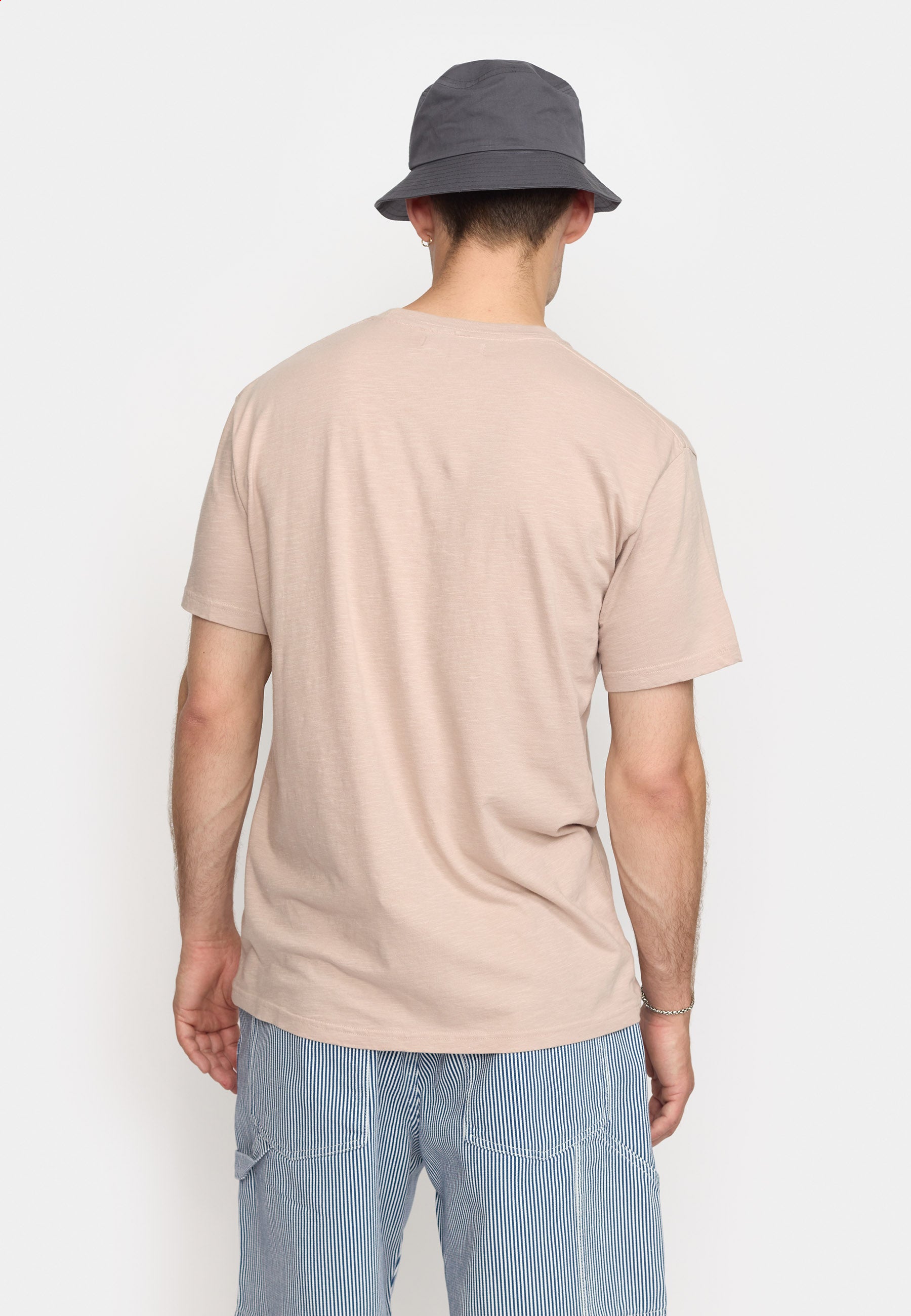 Loose-fitted t-shirt with a round neck and short sleeves, made in an organic cotton-jersey, with a weight of 160gsm. The fabric has a subtle uneven slub structure that gives the t-shirt an easy summer vibe. The finishing of the t-shirt adds softness and ensures stability and durability to the style.
