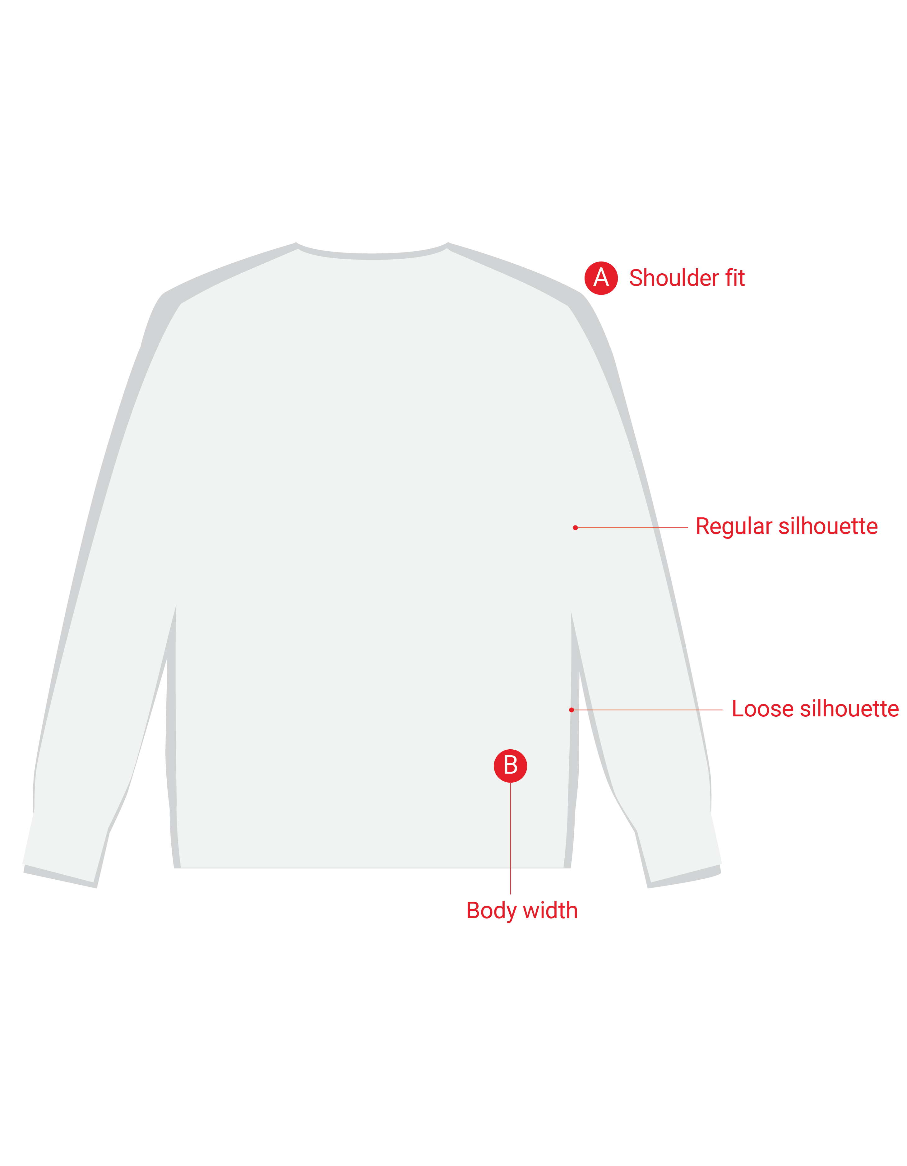 The armhole seam on the regular-fitted sweatshirts is placed where the shoulder ends. On the loose-fitted sweatshirts, the armhole seam is dropped a few centimeters.