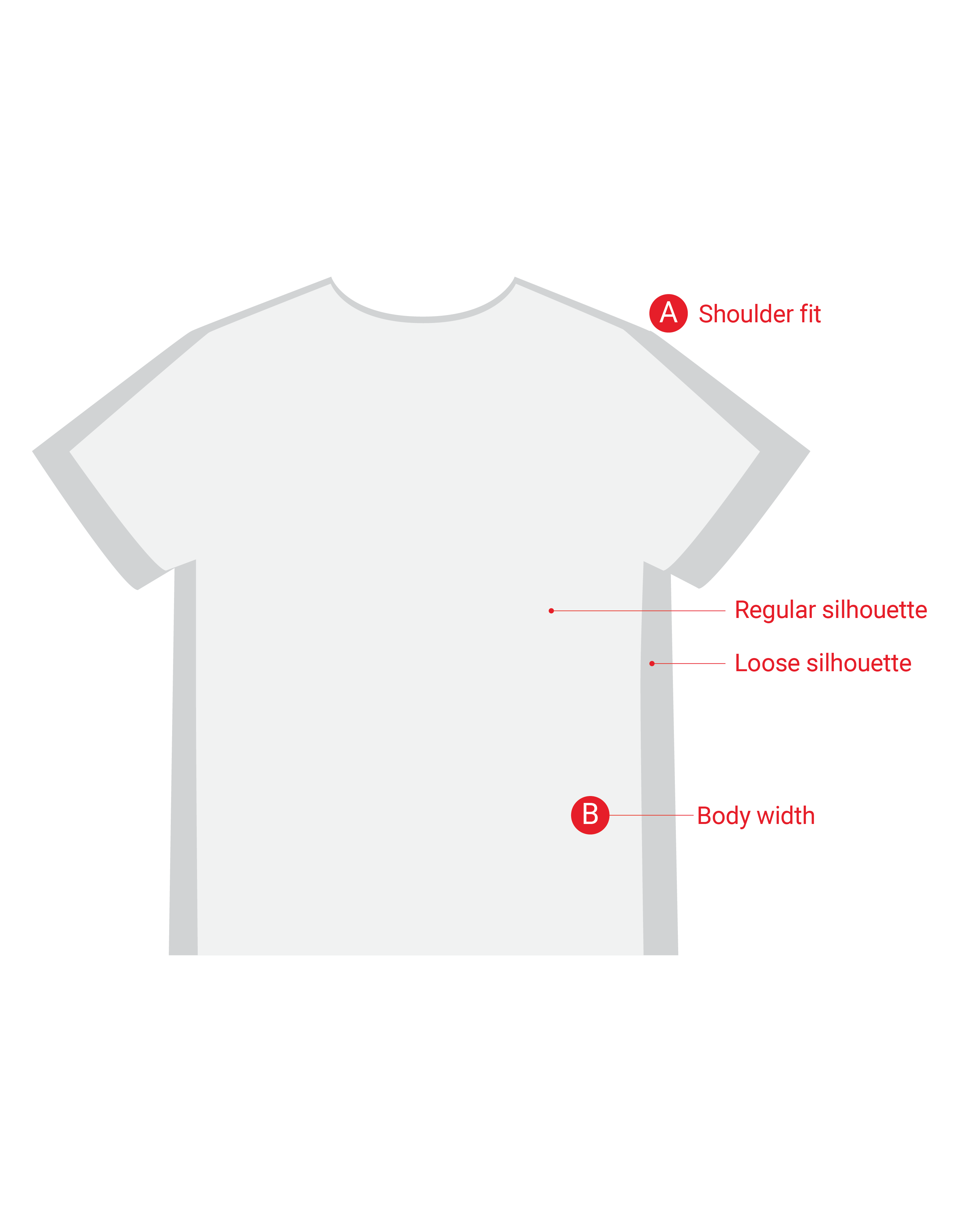 The armhole seam on the regular-fitted T-shirts is placed where the shoulder ends. On the loose-fitted T-shirts, the armhole seam is dropped a few centimeters.